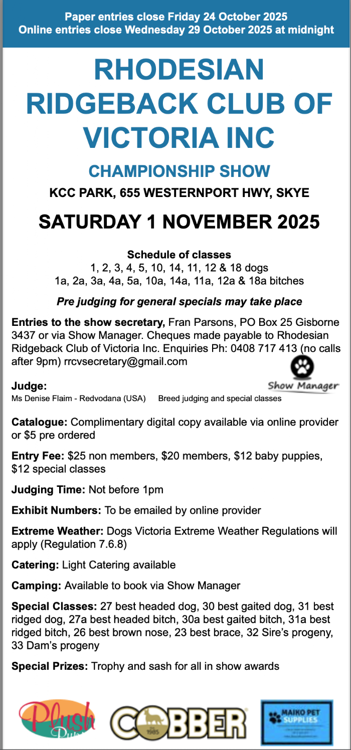 Please consider joining and becoming part of a vibrant community of Ridgeback owners- the form is on the membership page. And do come along to the shows below to see the dogs and breeders
